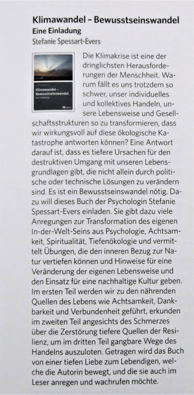 Damit blickt die Autorin durchaus vielseitig und anspruchsvoll auf das große Thema Klimawandel. Man spürt den lebenslangen Hintergrund als Psychotherapeutin und Soziologin. Die besondere Werthaltung des Textes kommt aus dem Feld der Tiefenökologie, ein naturphilosophischer Ansatz, der die Ehrfurcht vor dem Leben und die Liebe zum Leben im Zentrum hat.
